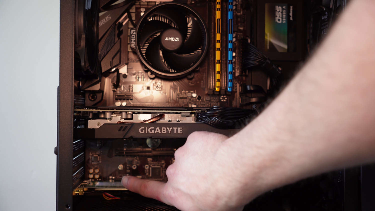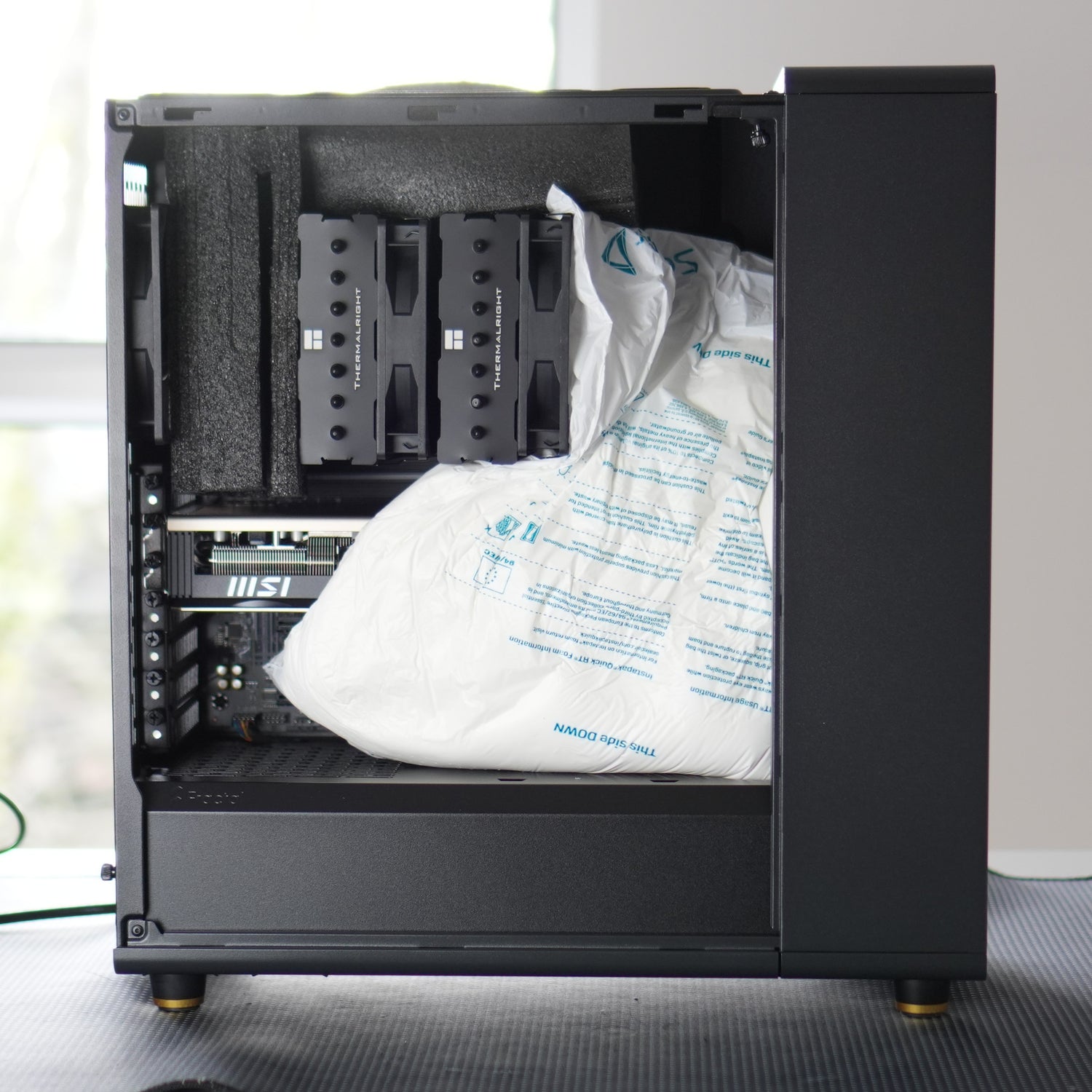 If your PC has a tower air cooler (i.e. not a liquid cooler), you will also need to remove the foam blocks that sit to the left and top of the CPU cooler, as shown in the photo