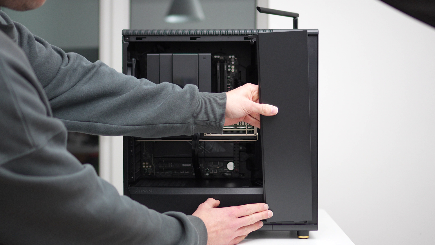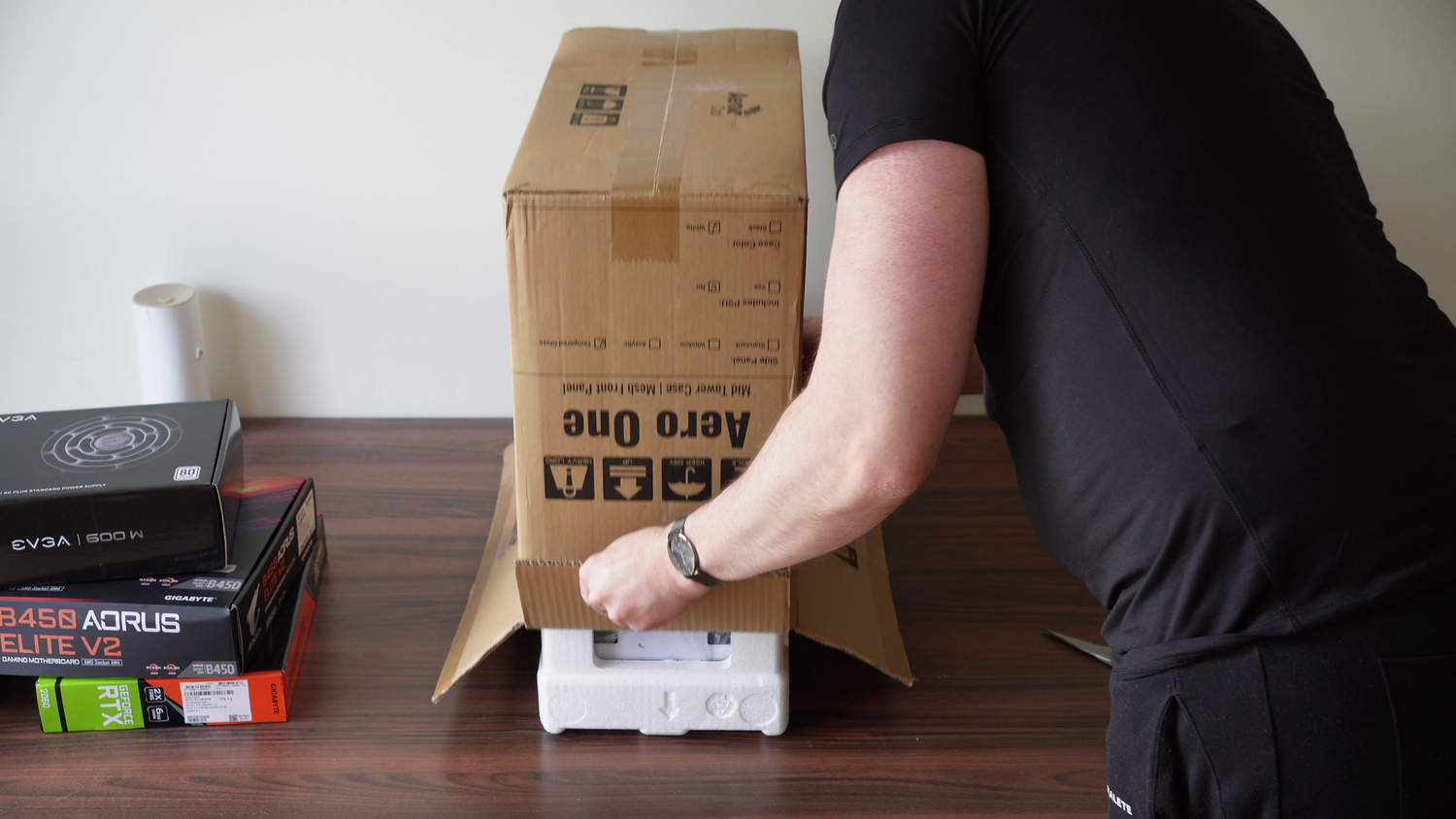 Use scissors to open the case box, and gently invert the box so that the PC slides out. Remove the foam blocks and plastic bag