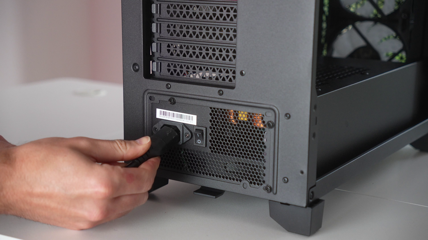 Plug in the PC's power cable - please use the one we supply you with. If you wish to use a longer cable, it must be a C13 cable and rated for 13 Amps. Do NOT use a smart plug with a PC - smart plugs cannot handle the changing power requirements a PC has