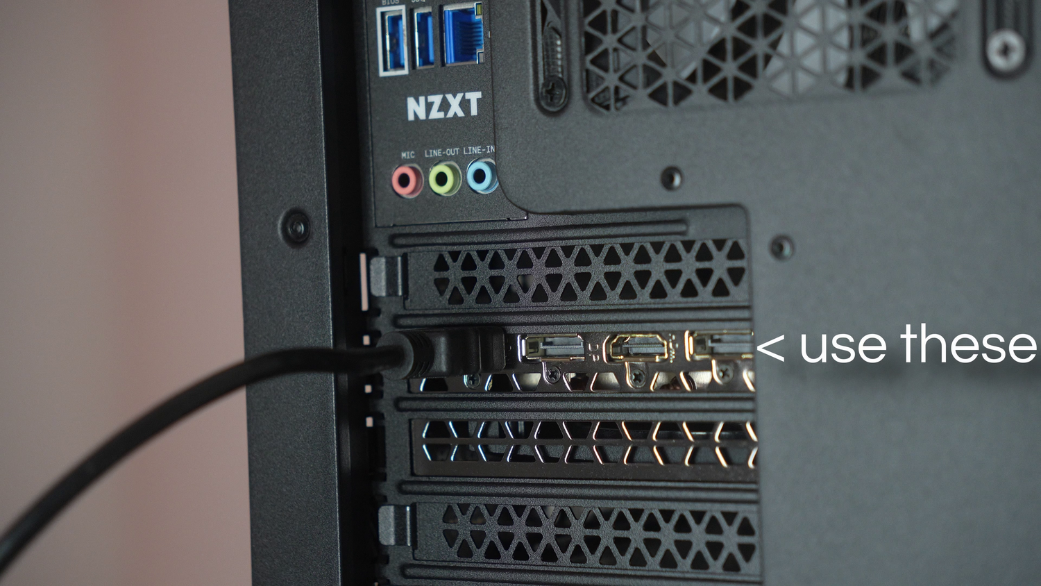 Plug in your display cable (from your monitor/TV) into the ports on the graphics card. You can use a DP cable or HDMI. We recommend DP but both will work. Old cables can cause issues, so if you get no display, or a flickering display, try a new cable
