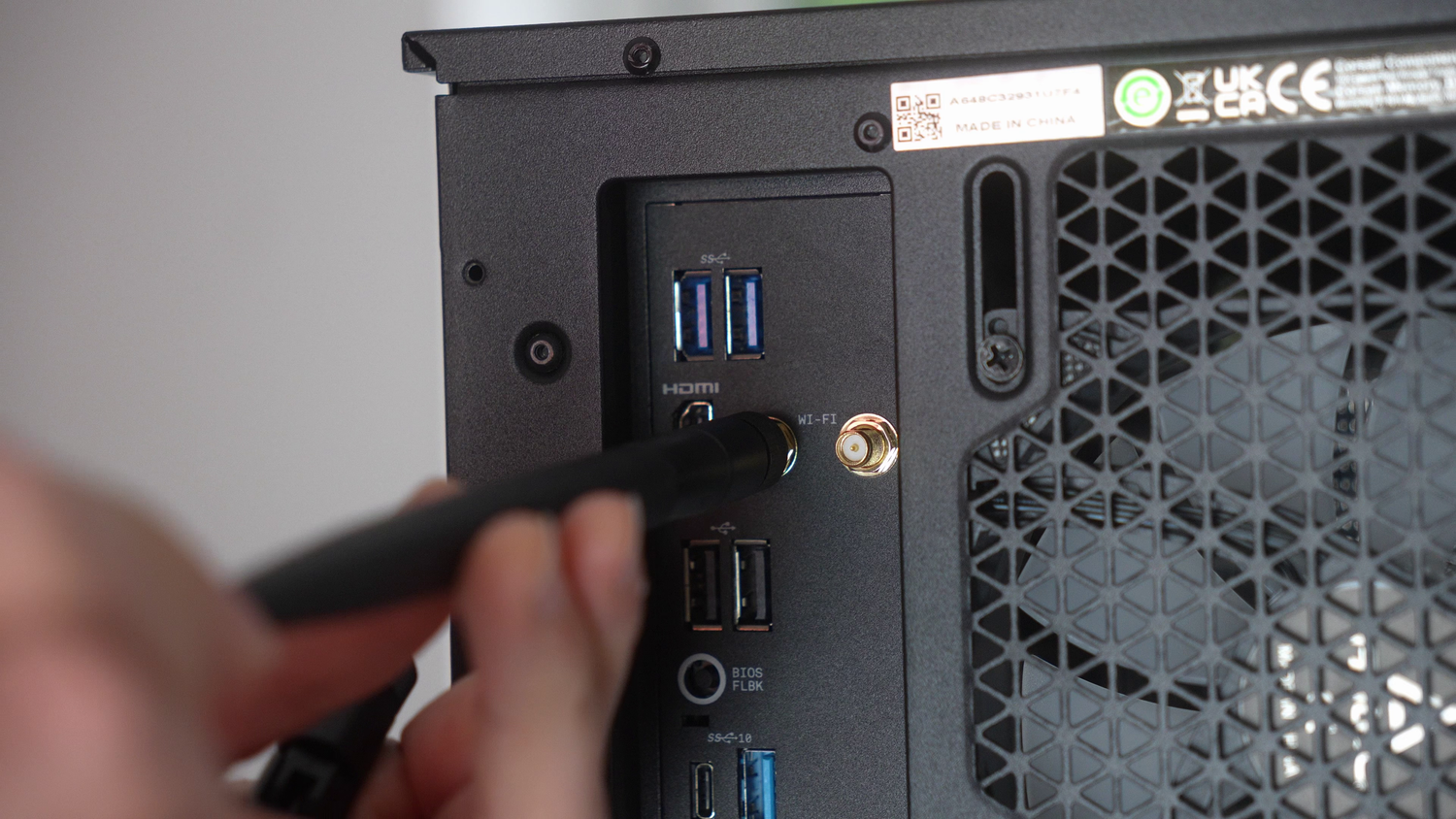 Attach the WiFi antenna. These come in the form of sticks or magnetic base blade units. Most of them simply screw into the gold posts as shown here. Some motherboards have antennae that are simply push-to-fit.