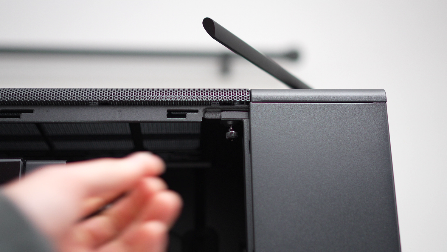 There is a small thumbscrew towards the front-top of the case. Loosen this to enable you to remove the small steel panel here