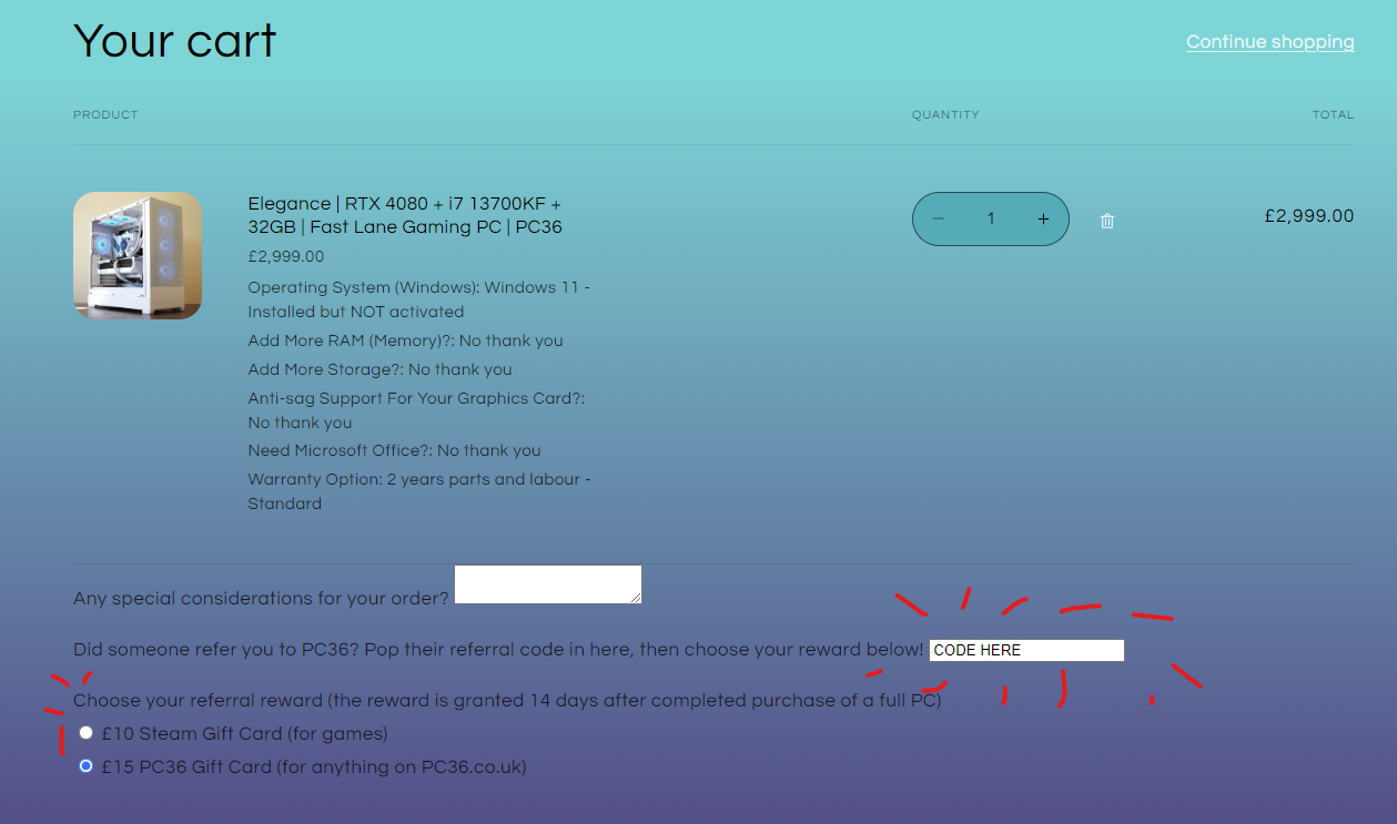 This is where your referral code goes when your friend adds their PC to the basket. In the cart page, simply find the box and pop the code in there
